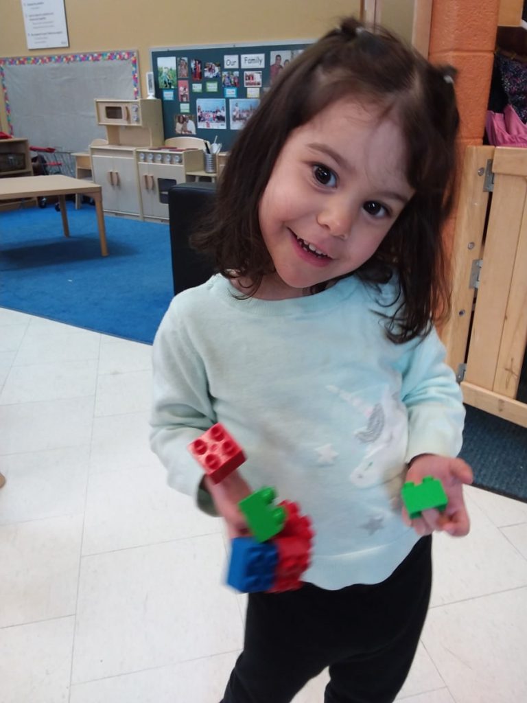Today, during activity time, Victoria displayed her imagination in a playful way. She took LEGO blocks and placed one on each finger of her right hand. With a curious smile, she transformed something simple into a game full of creativity.