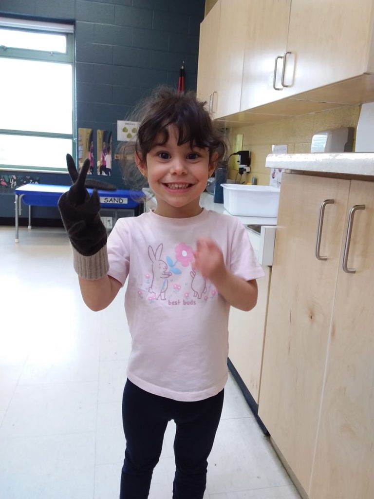 Today, during activity time, Victoria surprised everyone with a simple yet meaningful gesture. She placed a glove on her right hand, proudly claimed it, and said in a clear voice: “glove.”